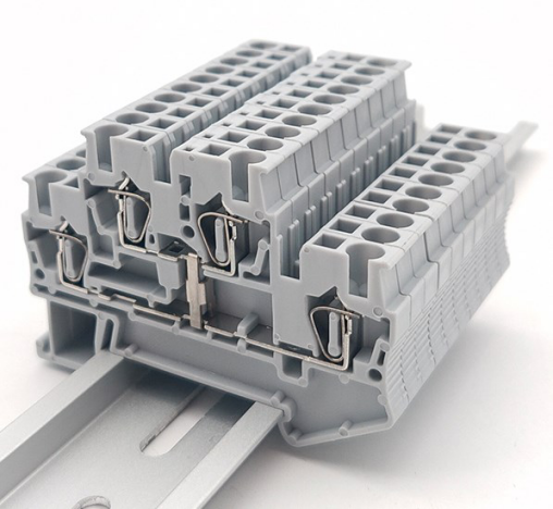 Stackable terminal blocks can be mounted next to each other to save space; they are typically DIN rail mounted devices.
