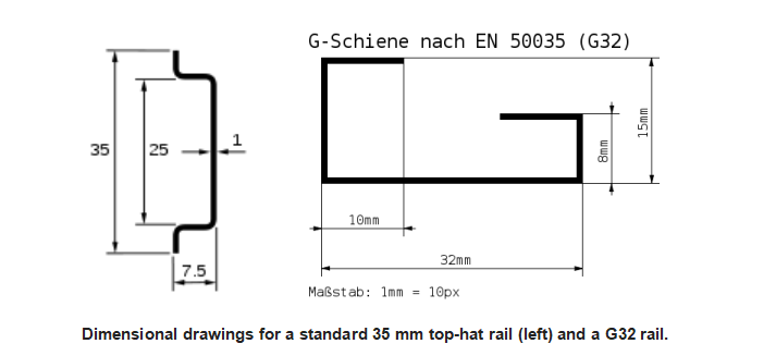 G32 rails are shaped like a letter 'G' and are 32mm wide. They can accommodate terminal blocks rated to 600V.